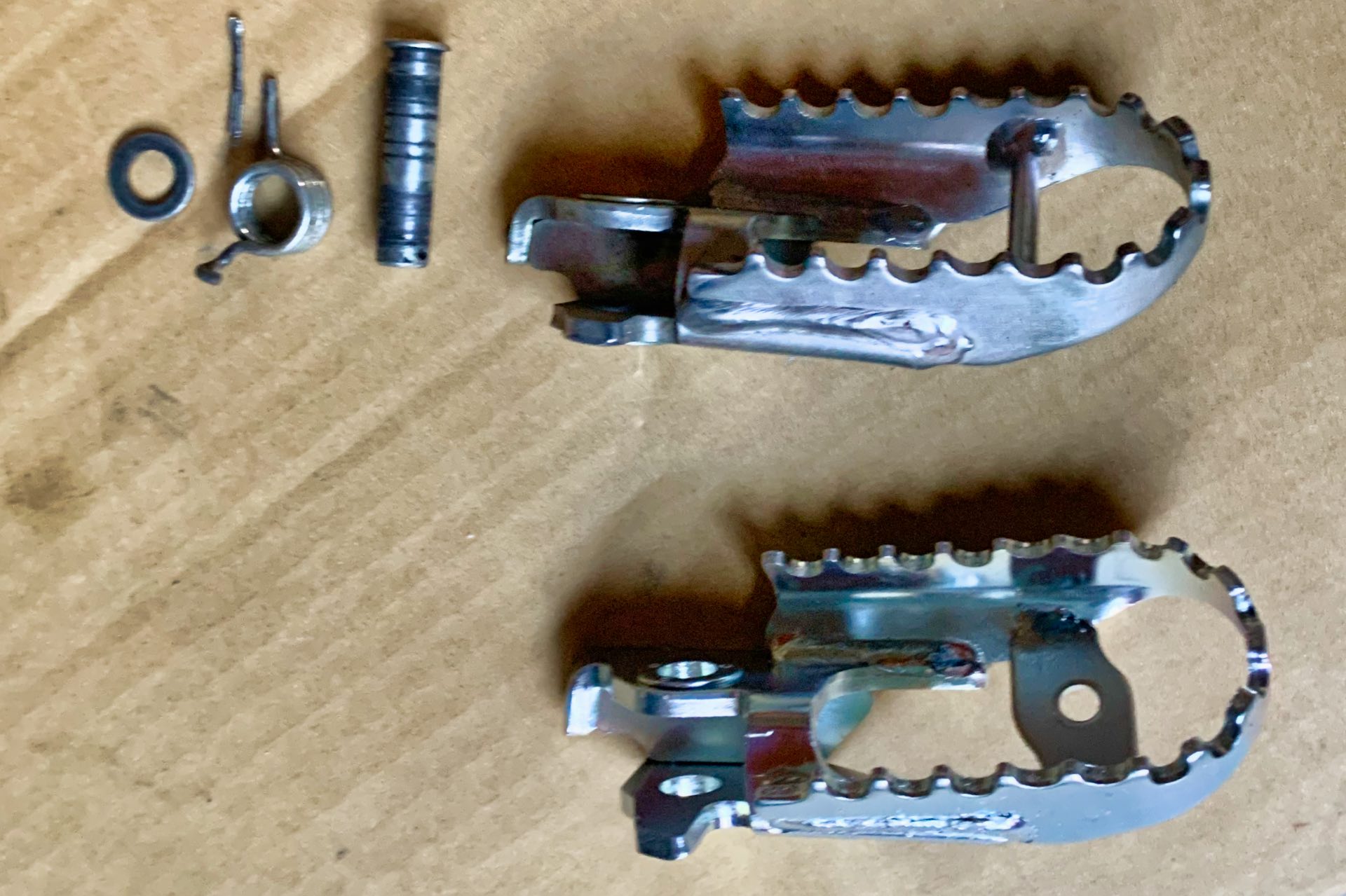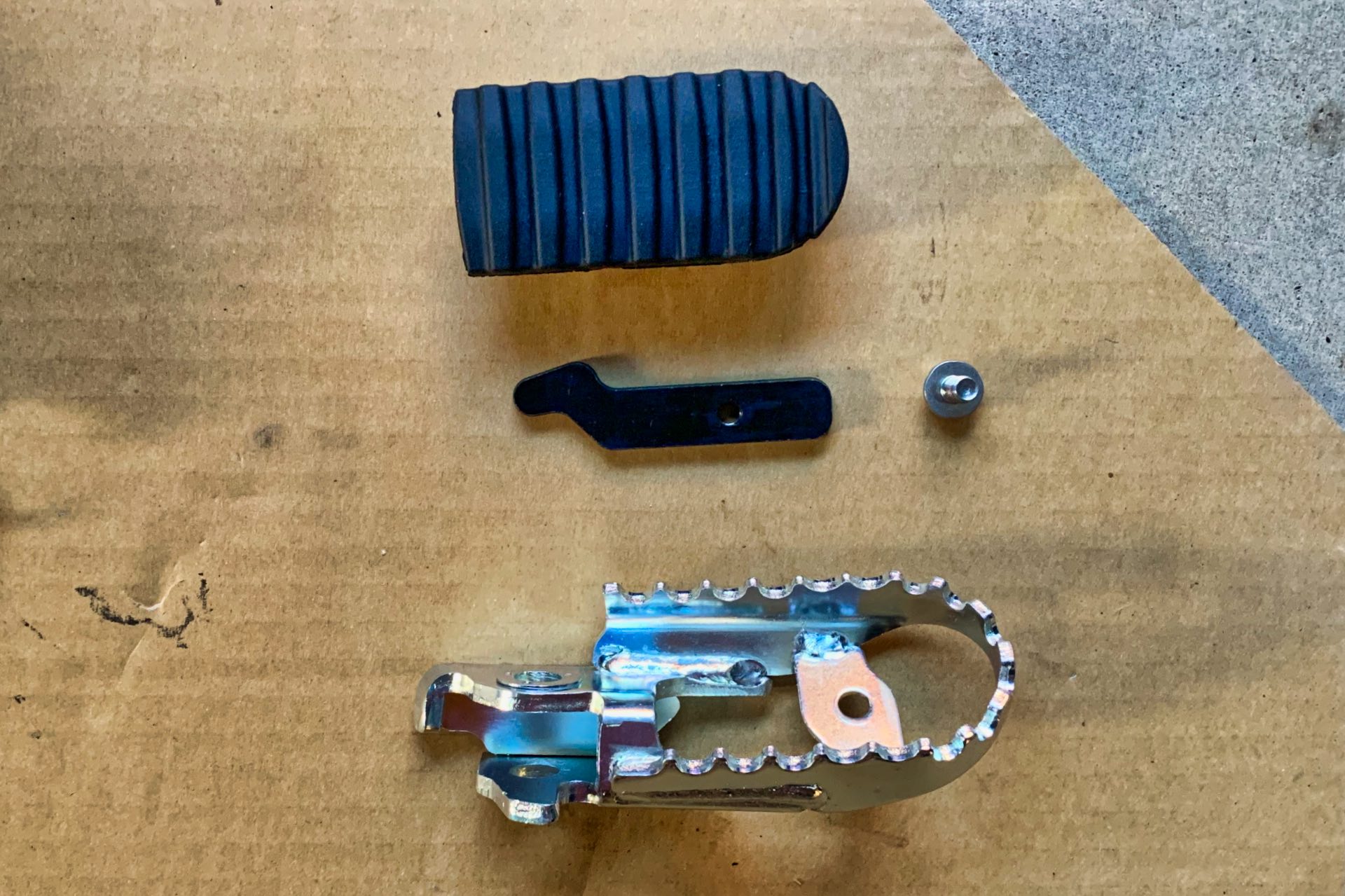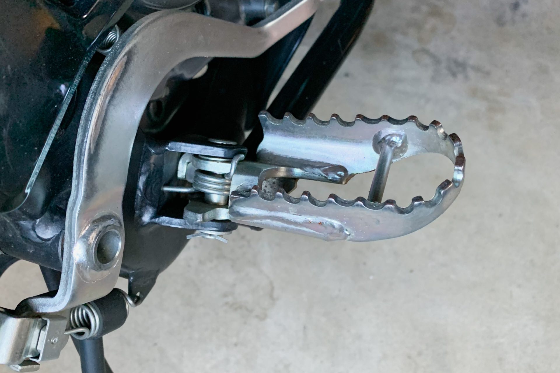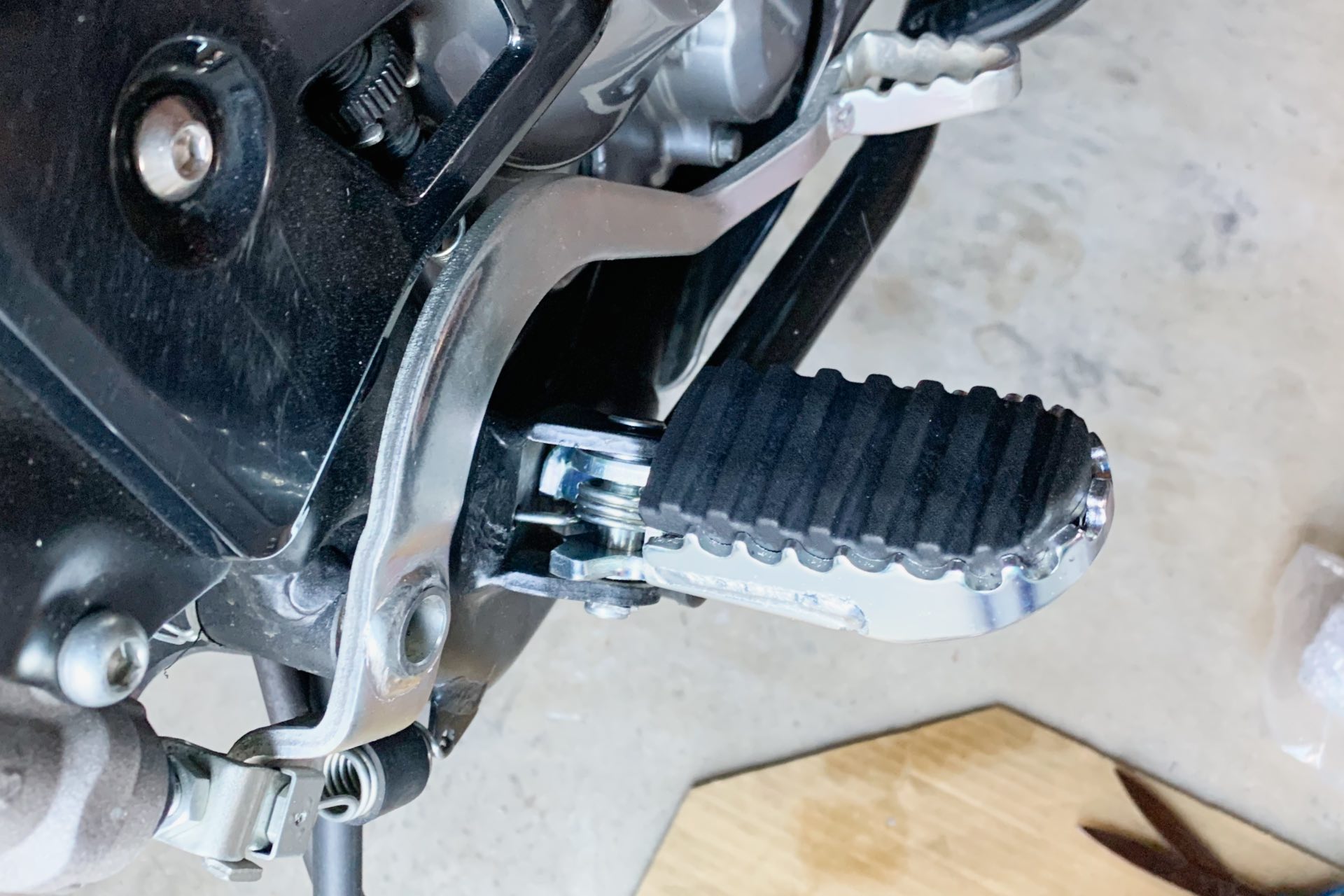 MD44 CRF250 はオフロードバイクなので金属剥き出しのフットペグ(ステップ)が標準です。