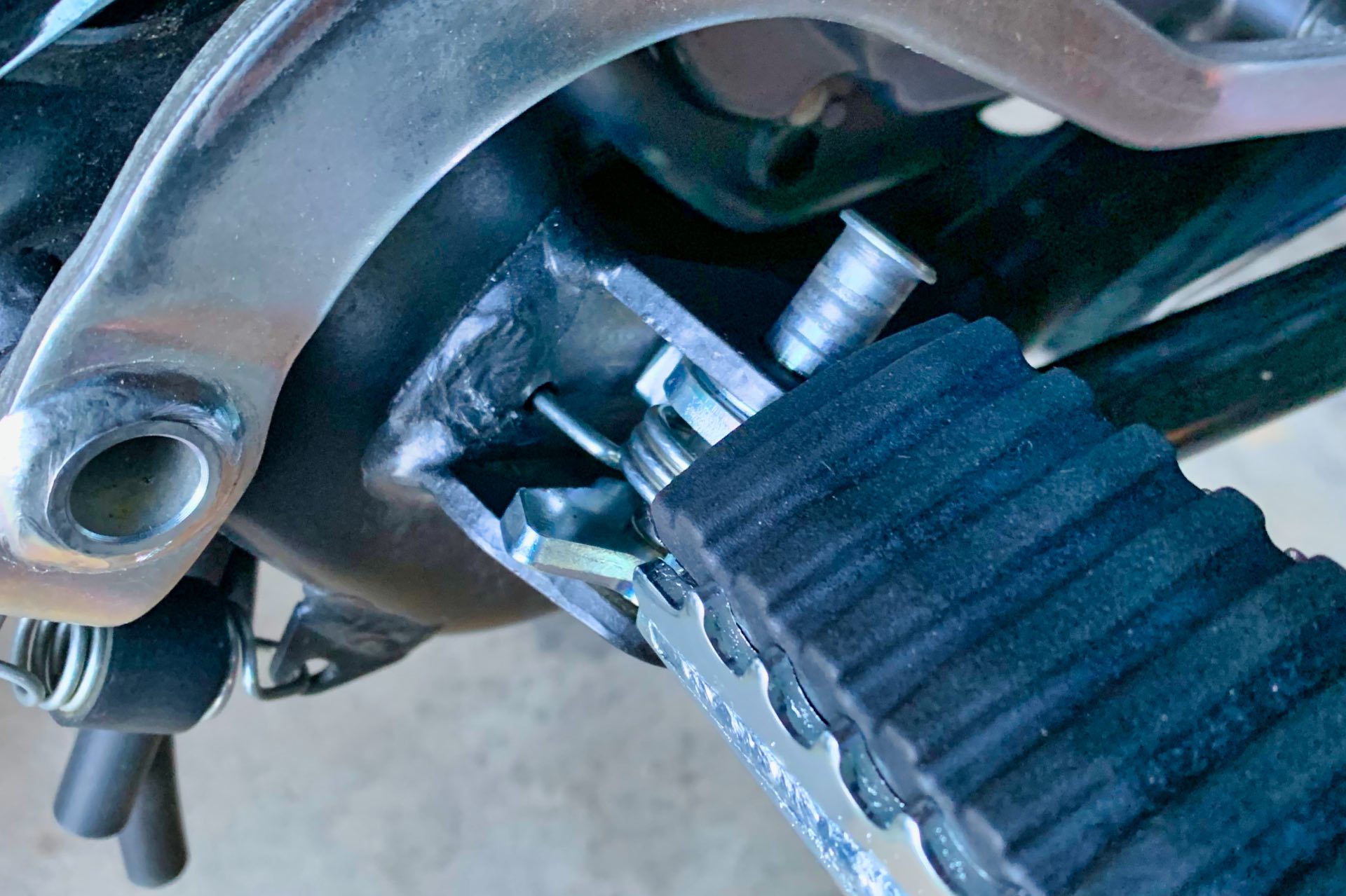 フットペグ(ステップ)は、「ステップジョイント」というピンが可倒式ステップの軸となっています。