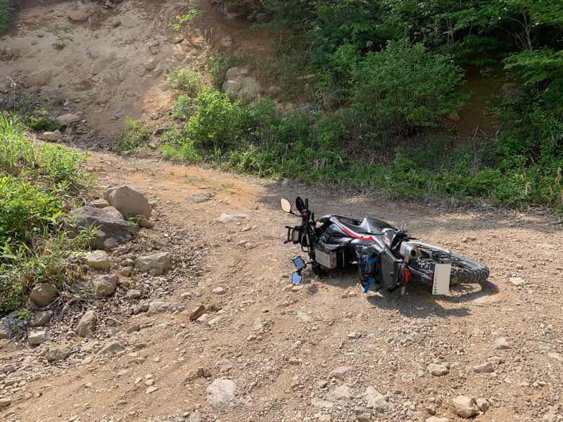 ほぼ立ちゴケですが、バイクを谷側に倒した時に、自分自身は転ぶと怪我をすると考え、坂の下の方まで重力に脚力が負けて走り出し、止まれずに草むらの寸前でこれ以上行くとヤバイかもというところで、火事場の底力が発生し、なんとか自分だけは転倒せずに踏ん張れました。(本当はどうなったのか覚えていない、こんな山奥でそれも単独で怪我をしたら考えただけでもゾーとします)