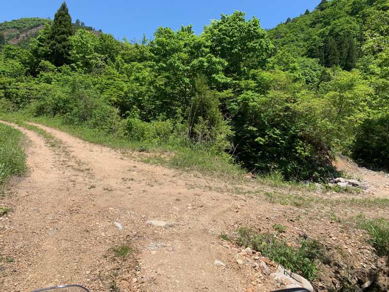 舗装が切れて、砂利道になると、路面は荒れて、山側から谷に落ちる水は、道路を横切るように土が盛られ、比較的大きめの石が撒かれているのでスタンディングポジションを強いられます。