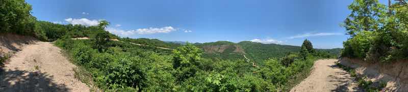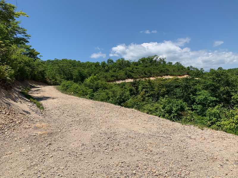 林道林谷線の奥の作業林道. ジグザグの荒れた未舗装の急斜面を登っていくと一気に1000mを超える天空の林道に. オフロード95%