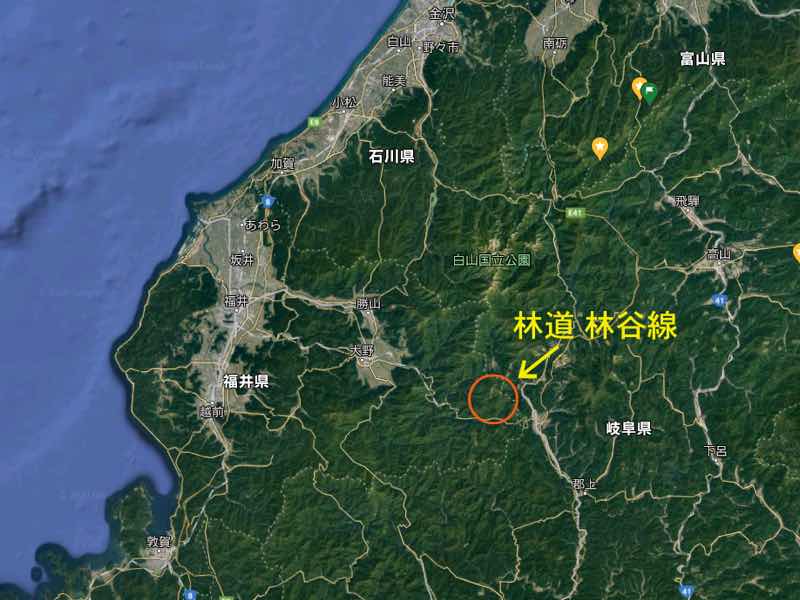 元々あった道路は(赤い線)は林谷川(福井県大野市箱ケ瀬)から蓮原川(岐阜県白鳥干田野)北濃辺りに続くように考えます。