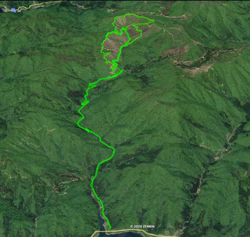 ナビのGPSのデーターから、Google マップの航空写真で浮かび上がる林道よりも南側のルートがあることがわかりました。