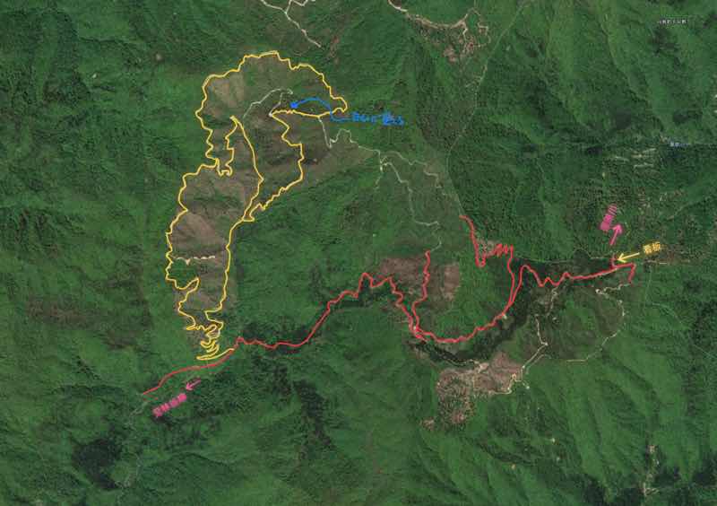 外側の黄色のところは、尾根近くを通る林道で、景色はとてもよかったですね。