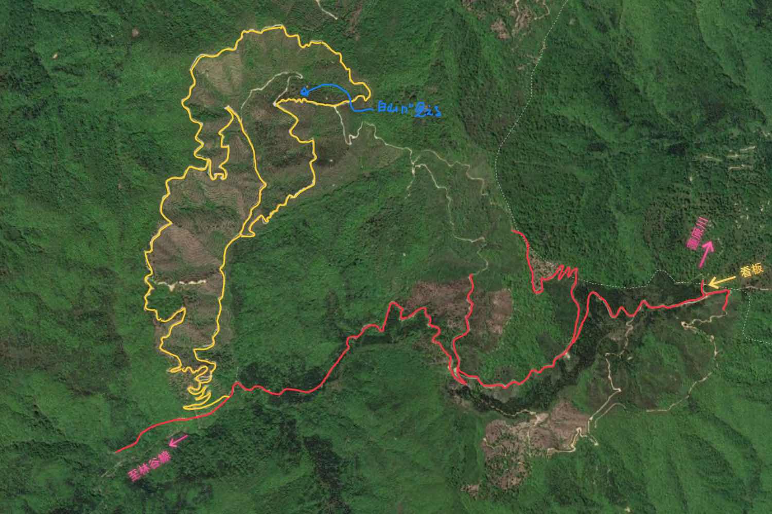 2021年は尾根を通るルートを散策 黄色い文字は黄色い看板のあった場所