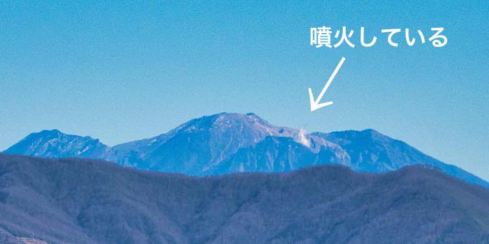そして、御嶽山を望遠撮影した画像をよく見てみると、手前の山から煙が見えます。(Nikon Coolpix P1000)