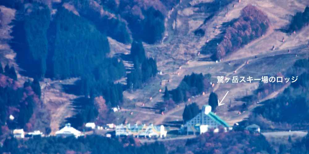 斜め左下にスキー場らしきものが見えたので、拡大してみると、どうも鷲ヶ岳スキー場のようです。(Nikon Coolpix P1000)