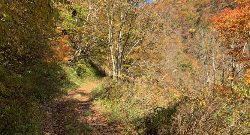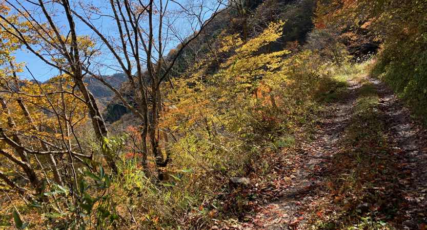 紅葉の季節で、前回の新緑からすると、木の枝の葉っぱが少なく、川の横を登って行く時の林道全体が日差しの光があって明るく、川の水の流れも良く見えていい感じです。