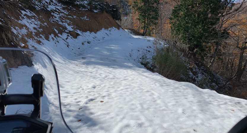 砂と瓦礫のところは雪があっても、意外と普通に走れましたが、ぬかるみや大きめの石にハンドルがとられることがあり、それが崖側に車体が向くとヒヤリとします。(ソロなのでリスクは極力避けます)