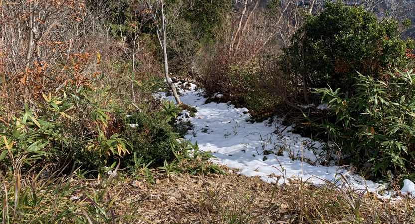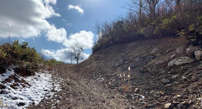 白山が見えたところから先は、北斜面で雪があり、なんとか通過できそうですが、上の写真の南斜面を通って山(作業林道)を降りる準備に入ります。