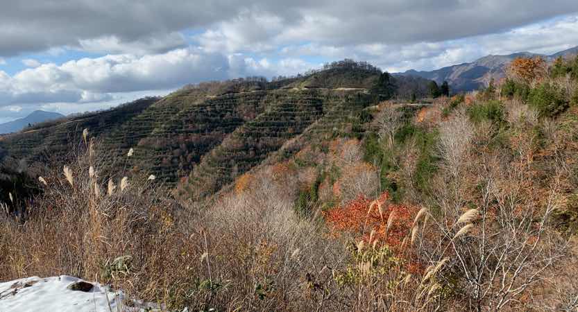 南斜面の尾根(上の写真のどこか)を走っていて、ふと止まったところから東方面に目をやると(下の写真)、林道がある峰と峰の間の、その先の山の向こう、さらに遠くに雪のかぶった山頂が見えました。(肉眼の方がもう少しはっきりと雪の山頂が確認できました)