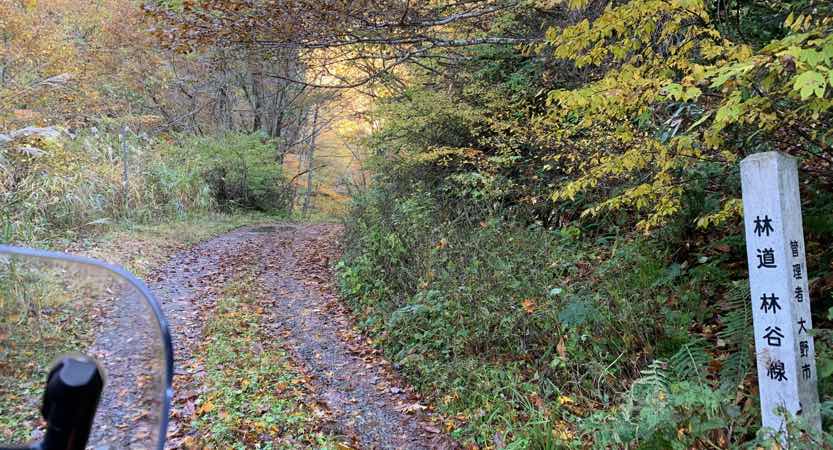 林谷林道の入り口は舗装道路でしばらく走ると、川を超える橋があって、そこから川沿いに未舗装路を走るルートになります。(未舗装路は、所々にある排水のために作られた道路に対して横方向に作られた洗い流しの役目をする盛り上がった土の段差があって、一般の乗用車での乗り入れは難しいですよ)