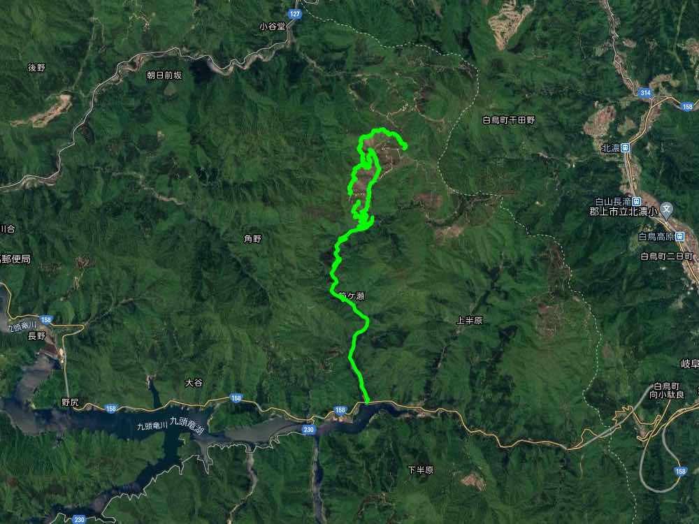 前回に林道林谷線の地図を掲載したので、今回は、国道158号線九頭竜湖辺りから林道林谷線とその奥の作業林道を実際に走行したナビのルートの記録を示しました。