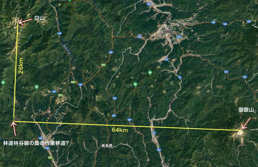 そして、途中で見えた白い山頂を御嶽山と決めつけて、地図上で白山と御嶽山までの直線距離を測ってみると、白山まで約26km、御嶽山までは、64kmとそんなに遠いわけでもなかったことが判明しました。
