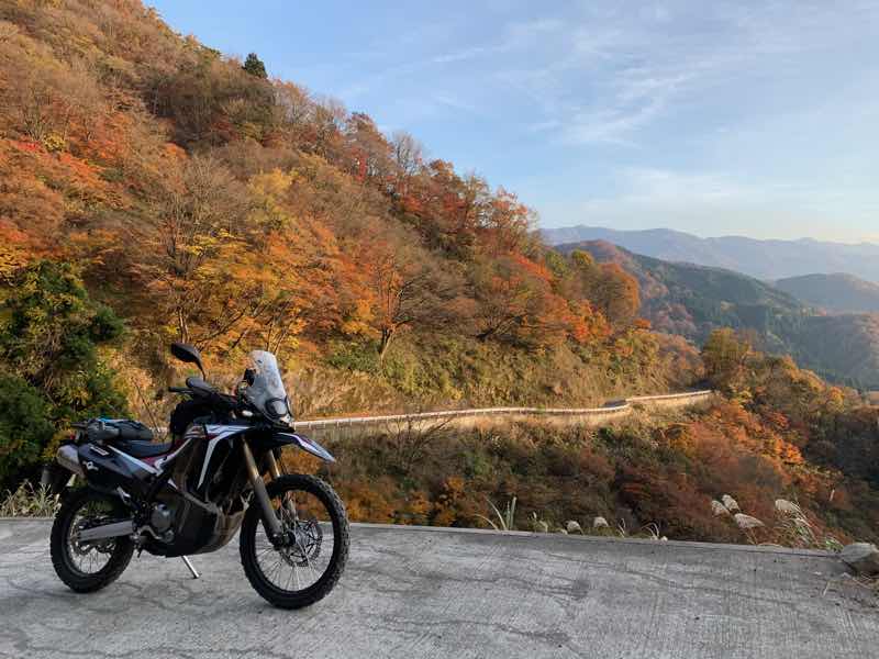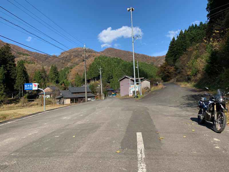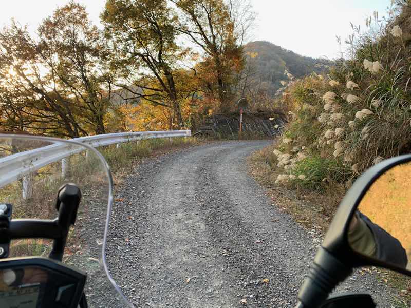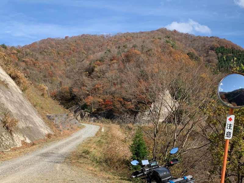 先日の綺麗な紅葉をじっくりと見るために、先日とはルートを反対側から走ることにしました。(実は、だいぶん迷いながら、ここの林道の入り口にたどりつきました。地図を見るのに止まったところで、ライダー&ゲストハウス べこ亭の人が心配で見にきてくれました)