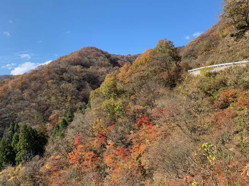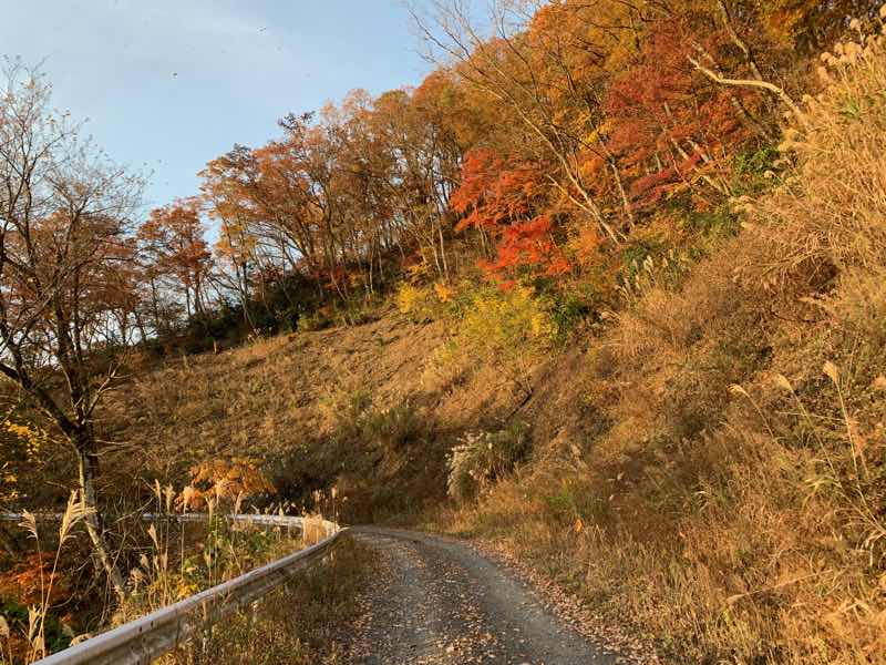 道路のある山には、色付いた木々の葉っぱが色とりどりで良い感じで目を楽しませてくれました。(日が傾きかけているので少し暗いですが、綺麗ですね)