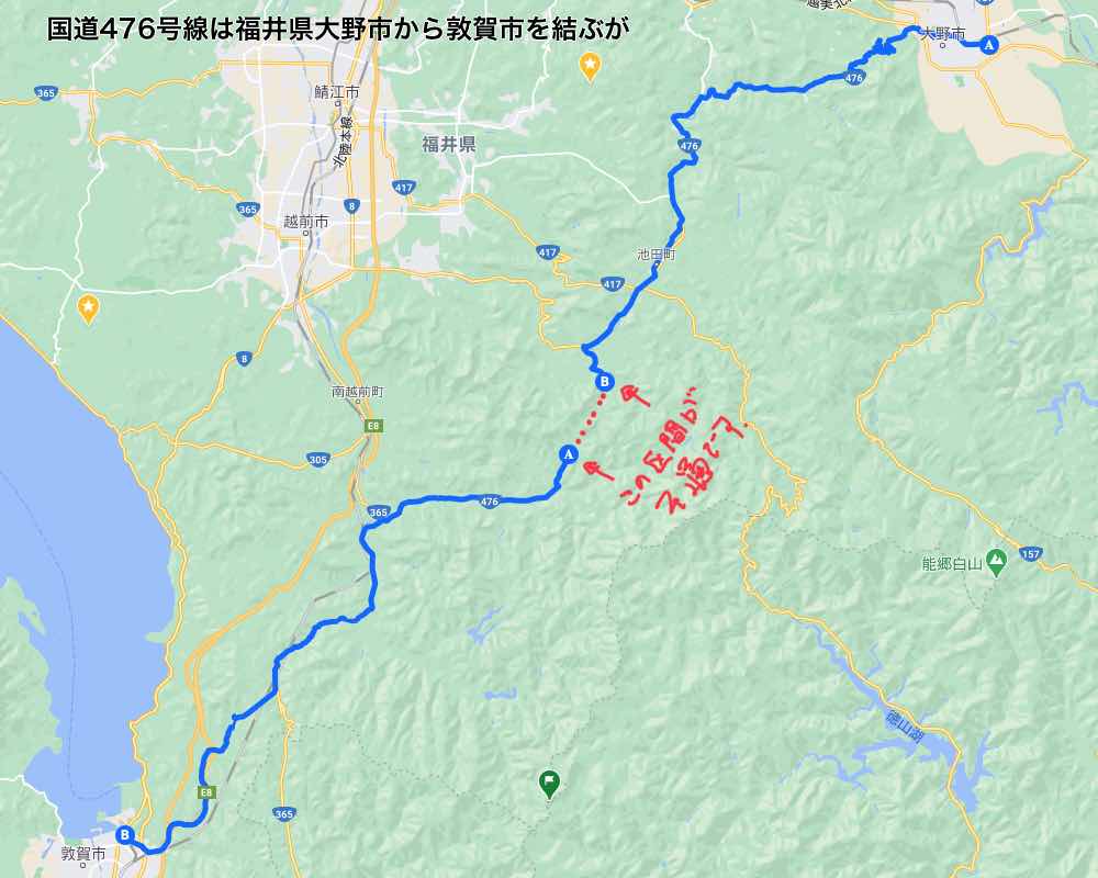 国道476号線は福井県大野市と福井県敦賀市を結ぶ道路としていますが、今立郡池田町東俣 – 南条郡南越前町杣木俣「そまきまた」(段ヶ岳峠)が不通区間となっております。(道路自体が無い)