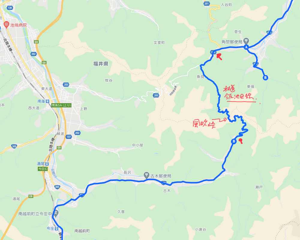 上の地図は、森林基幹道 今庄池田線を通るルートです。