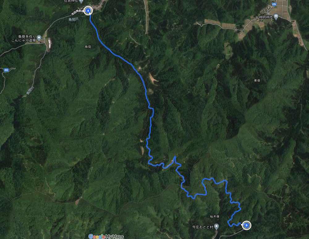 上の赤丸で囲った部分は魚見峠(岩谷峠)は全線舗装されているが、車で通るには、とても狭いので注意が必要です。