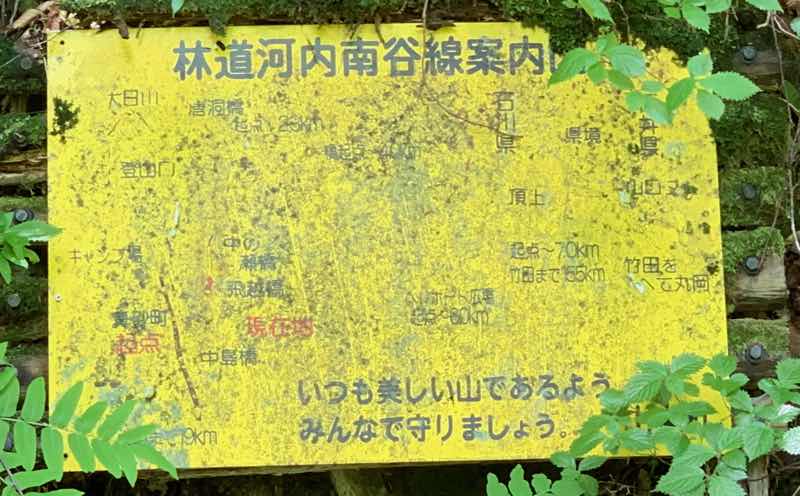 真砂(まなご)から少し走るとよく読み取れない案内看板がありました。(林道河内南谷線)