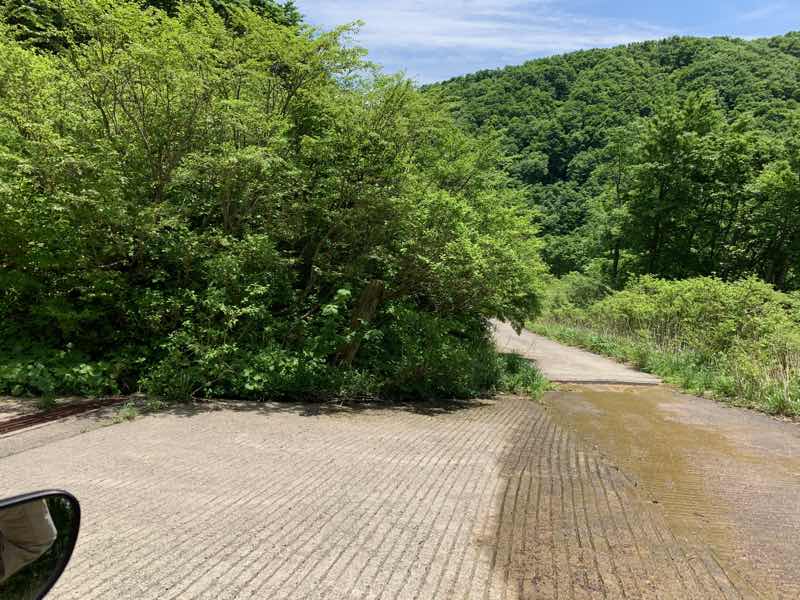 インターネットの情報では、バイクならば通過できるらしいが、道路が小川状態らしい。