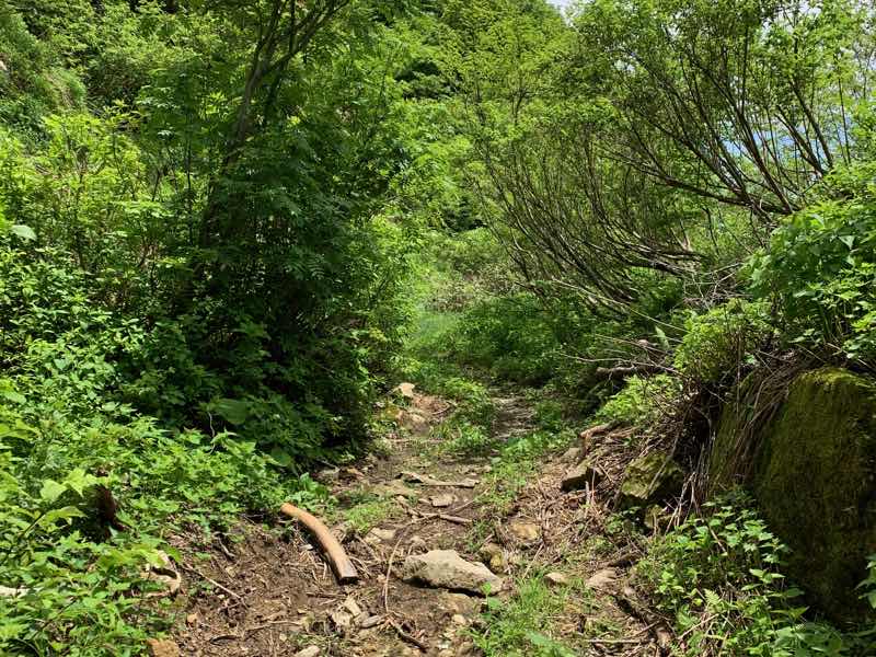 道路を塞ぐのは笹の葉と小さな樹木です。