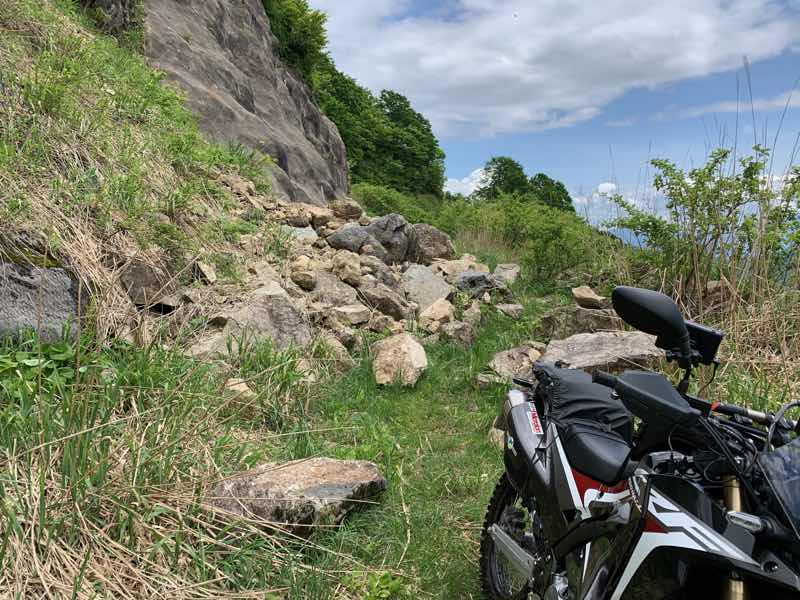 道路の左端(崖沿い)に、ちょうど小型バイクが一台通れるスペースがありました。(念のため歩いて調査します)