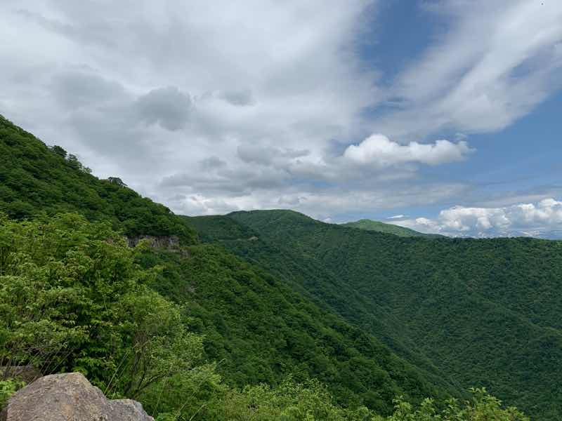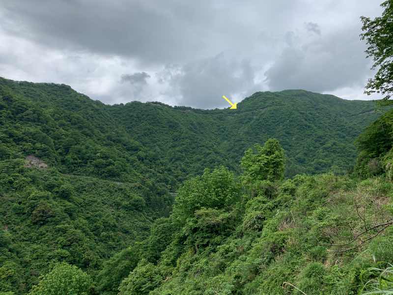 林道岩屋線のトラバース道が見えますね、眺めは遠くの山まで見えるように開けてきます。