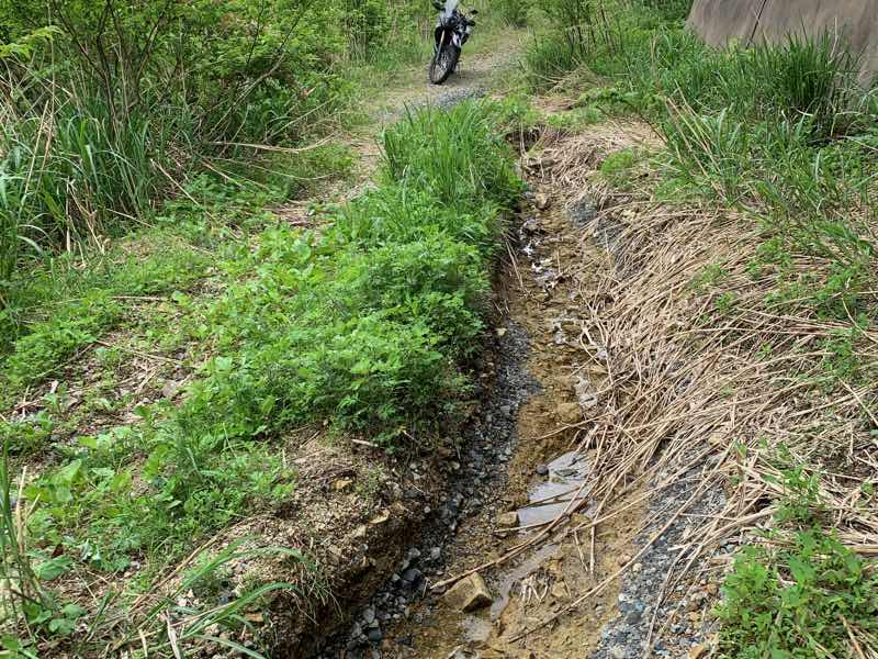雪解け水や雨水が流れた後が、ワダチに沿って大きな溝を作っていました。