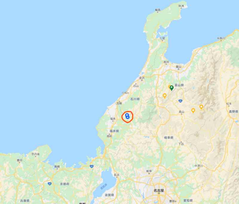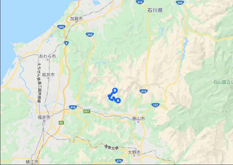 林道岩屋線は下の地図の赤丸で囲んだところ、石川県加賀市と福井県勝山市の県境近くの福井県側にある林道です。