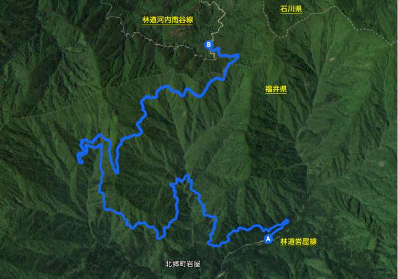 林道岩屋線は福井県勝山市北郷町岩屋と林道河内南谷線(福井県丸岡市上竹田と石川県加賀市山中温泉真砂町)に接続するルートです。