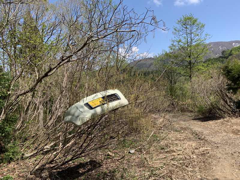 途中、道路が左右に分岐する近くに軽自動車のバンパーナンバー付きで木の枝の上に落ちていました。