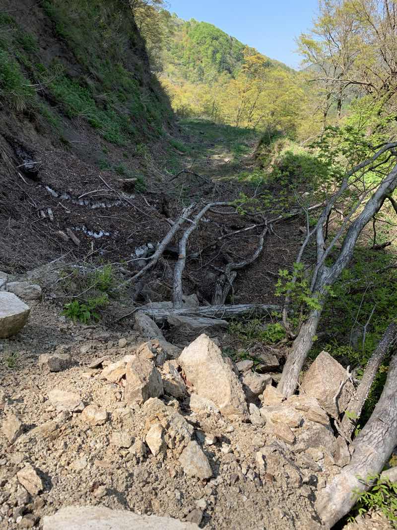 崩れた向こう側には、木が倒れ、その下には、まだ、雪が残っているようでした。