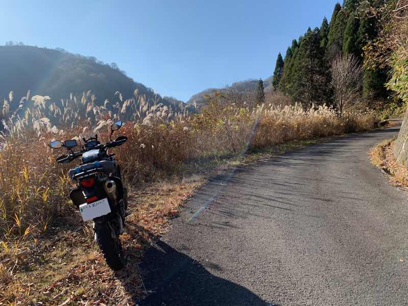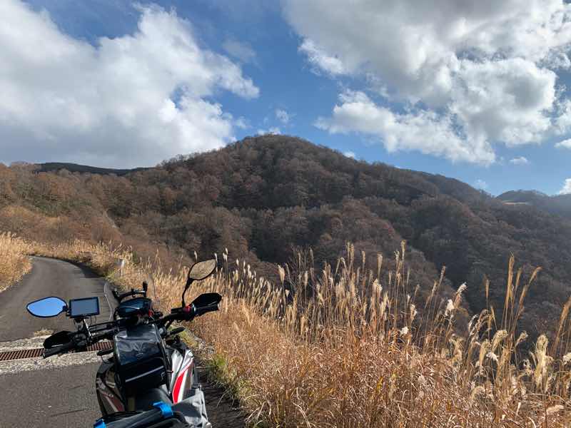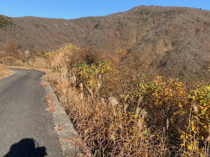ススキと絶妙にカーブした道路と横から迫る法面と反対側の山の感じが素敵です。(勝手な思い込みですが)