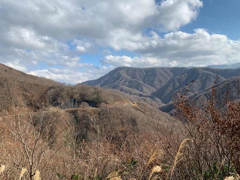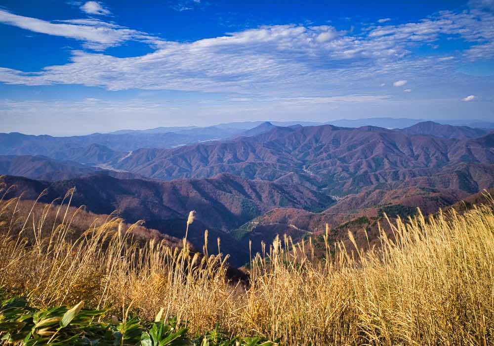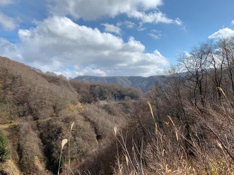 ススキの帆が太陽光線に輝いて見えますが、山の色はモノトーンに近づいて見えますね。(標高が高いところでは紅葉の時期は過ぎていました)