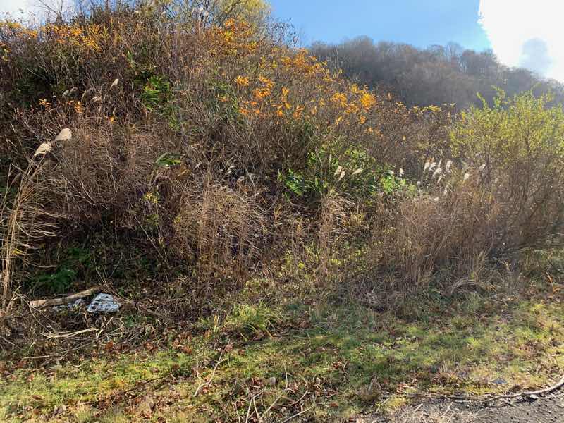 道路の壁の反対側(川があるはずの方向)は盛り上がっていて、その脇に藪が生えていますが、獣道のような空間が見えました。(写真では見えませんが)