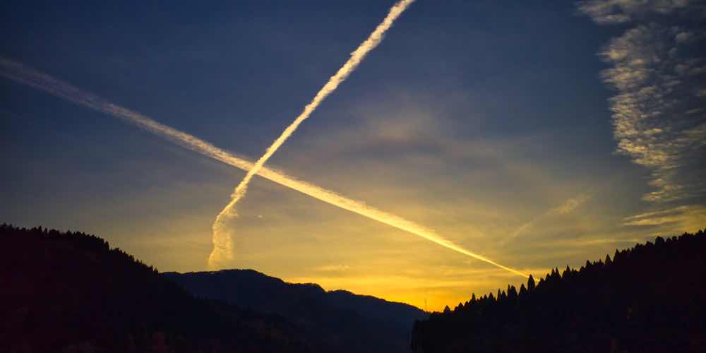 帰りの途中で空を見上げると、夕日にクロスした飛行機雲が・・・・・