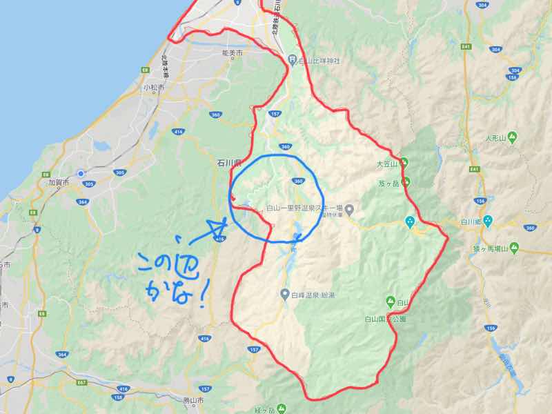 能登半島の下側に位置し、金沢市のさらに南側にある白山市にある林道です。