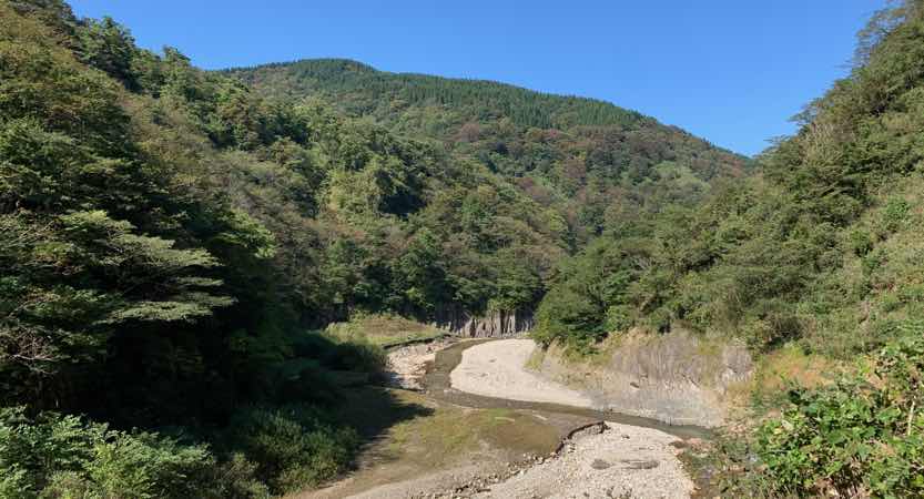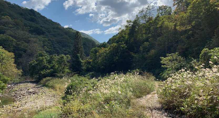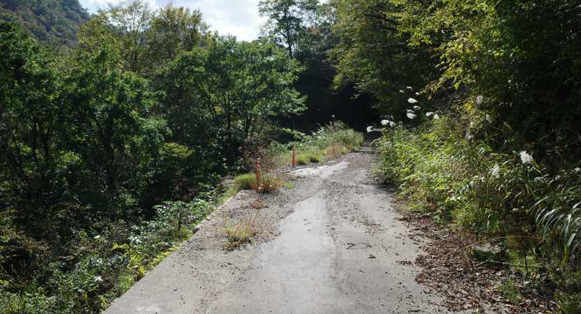 途中の置いてあるだけの通行止めのゲートを少しだけずらして、進んでみると、この辺は川のすぐそばを通るルートになっています。