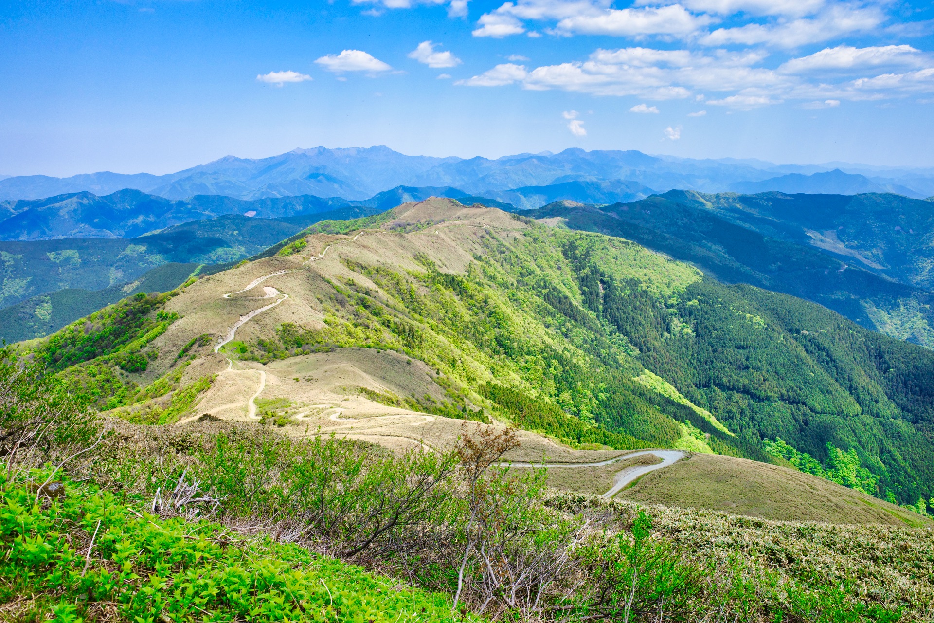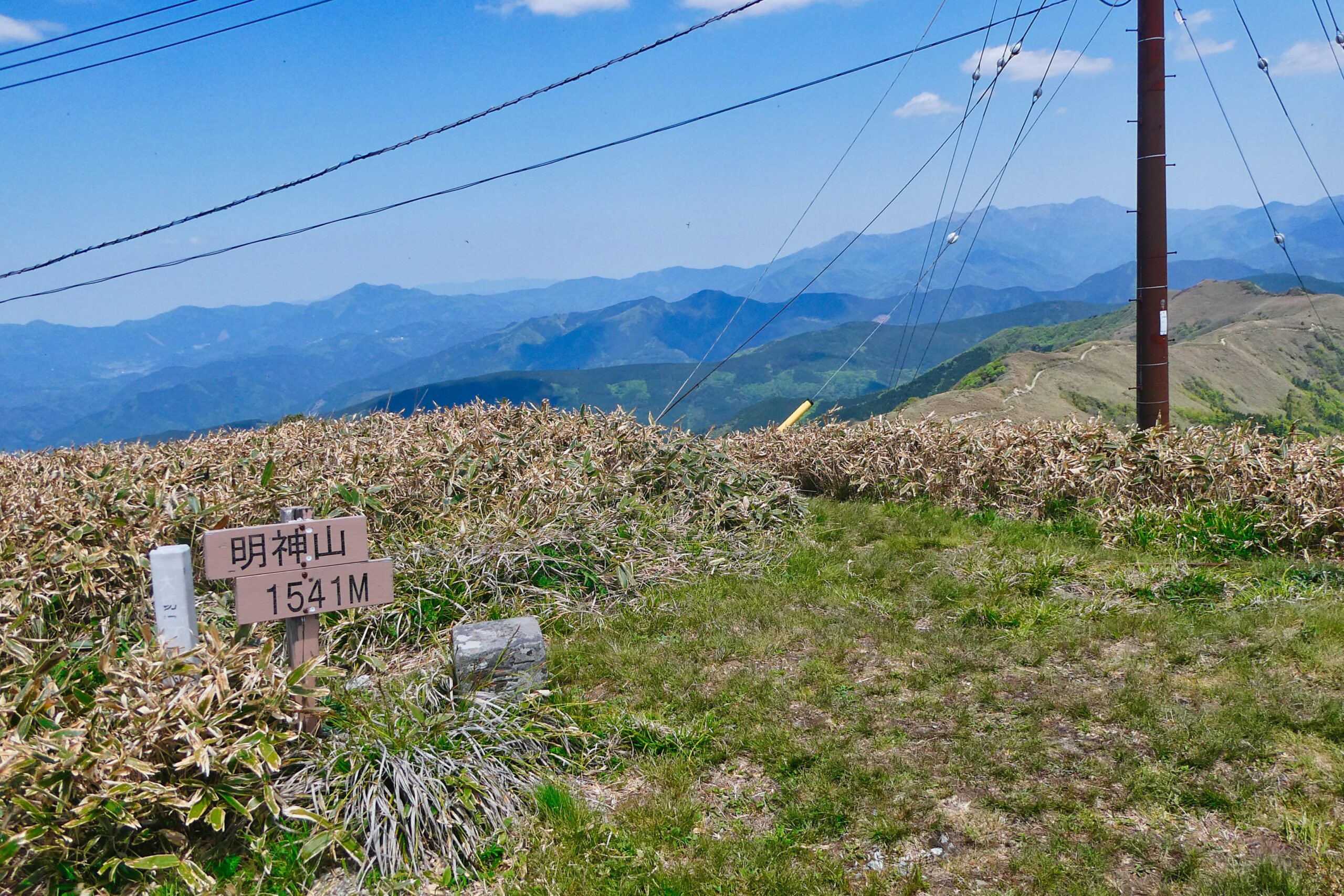 標高 1,541m 愛媛県との県境に位置し、山頂には国土交通省の雨量レーダーや平家落人伝説の明神山城跡があり、その山頂の駐車場から見る眺望抜群です。(上の写真)