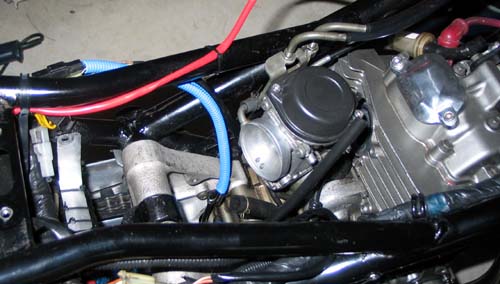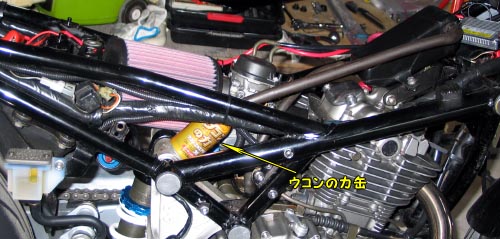 | パイロットスクリュを1回転と3/4戻しとし、メインジェットは#120に変更する。 アイドリングから5000回転までは結構スムーズになってきた。 高回転は9000回転くらいで失速する感じが強い。 6000回転から8000回転までもだいぶん良くなってきたけれど、もう少し滑らかに回転して欲しい。 7000回転くらいが少し段つきになるので、このへんはニードルジェットを弄る必要があるだろか。 (右の写真:シリンダーヘッドにリアブレーキのリザーバータンクが設置されていますが、エアクリーナーボックスを取り外したために行き場所が無くなったミッションの上辺りにあるブリーザーチューブから排出されるオイルを受けるために暫定的に取り付けた。) |