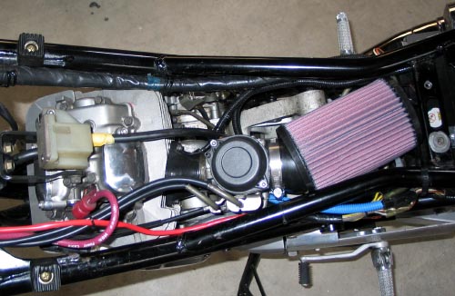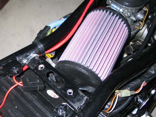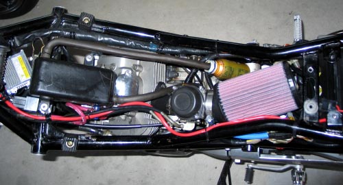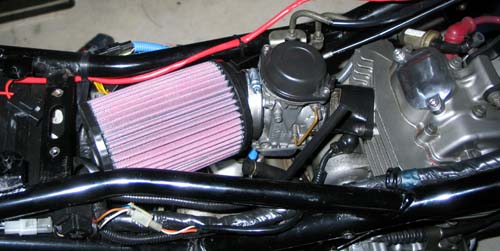 | 燃料タンクとサイドカバーを取り外した。 購入したK&NのRU-1380フィルターはキャブ側の口径φ62mmで全長も大きめのフィルターで、実際にノーマルのBST33のキャブレターに取り付けてみると、何とかギリギリ収まる大きさであった。 |