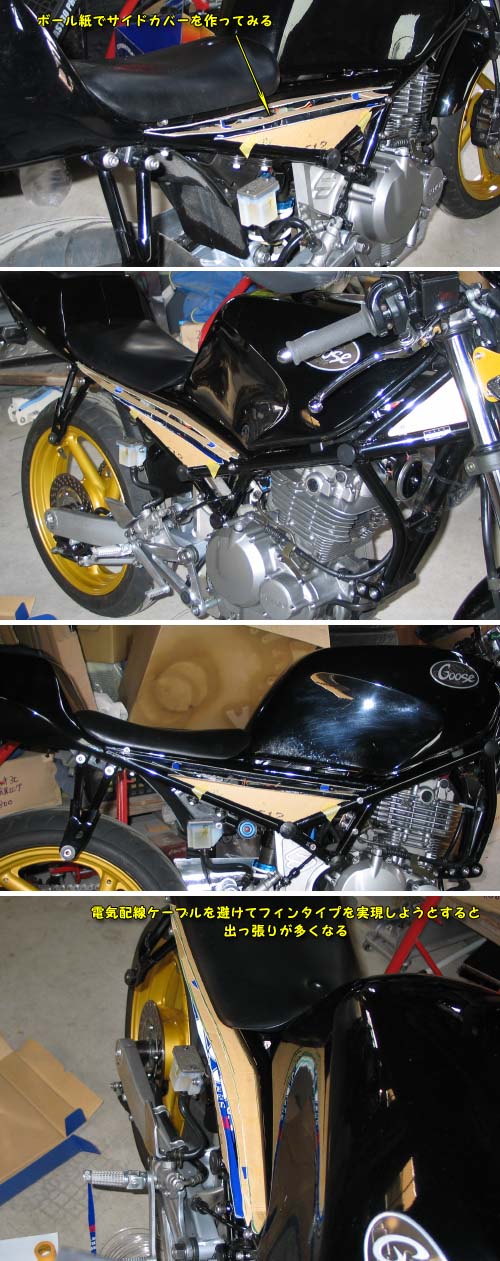 | まずは、段ボールでイメージした形に切り出して、実物大の物を作ってみた。 アルミ板で作ろうと思うので、重量を考慮して面積をできる限り小さくなるような形状を考えた。 さらに、自分で作れるような形状となるように工夫する事も忘れない。 だが、タンクとカバーに繋がる部分がスムーズでなく、取って着けた感じがあり、納得できない。 そこで、シートレールはカバーで覆うが下側のフレームを見せるようにしたサイドカバーを考えた。 1mmのアルミで作成する段階で、板金で形を整えたりする必要があるので非常に時間がかかり、素人には無理そうなので断念する。 また、カバーの後ろ側は純正のカバーのコピーを考えていたので、それならば、純正のカバーを切って作り直した方が簡単ではないかと。 それに、もとの純正に戻したい時は、オークションで中古のサイドカバーを買えばよいではないか。 |