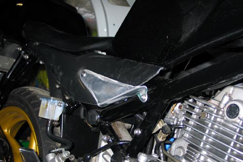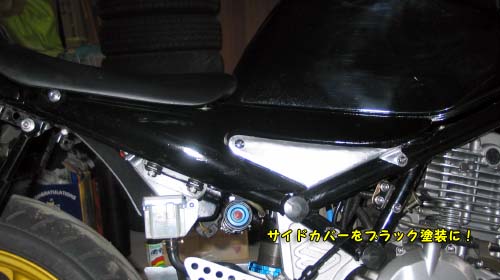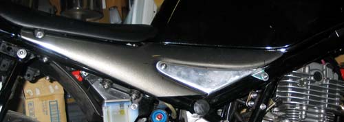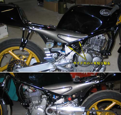 | あれこれ考えて、結局純正のサイドカバーを切って、小さくしてフレームが見えるようにすることにした。 フレームのパイプの見える部分はサイドカバーの前方に限定してカバーをカットした。(写真上) |