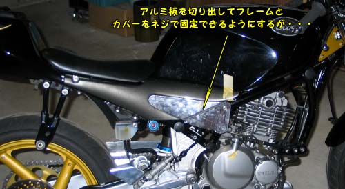 | このままでは、カバーを固定できないので、フレームのネジ穴2箇所とカバー中心のネジ穴を利用して固定を考える。 アルミ板1mm厚を切り出して写真(上)のように固定することに。 でも、イメージしていたものとは違う感じがする。 サイドカバーの固定をフレームの前方の2箇所で固定することを考えていたが、一箇所でも充分に固定されると考え、アルミ板のサイズを大幅に小さくすることにした。 また、350のサイドカバーのようにアルミでマン島のコーナーであるグースネックをかたちどる用に切り出し、さらにカバーの丸みに沿ってアルミ板をハンマーでたたきながら成形した。(少し凸凹だけど) |
