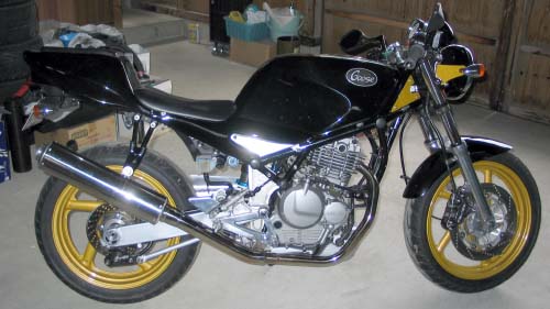 | まだまだ、作り込みは甘いけれど少し様になってきた。 全体的なバランスは、何となく良くないように感じるが、色をブラックに統一し、アルミをバフがけすれば、多少よくなるように思う。 また、サイドカバーの切り口をもう少し整える必要があるだろ。 |