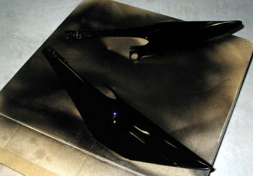 | 前回は、純正のサイドカバーをカットして取り付け金具まで作成したところで終わった。今回は、カットしたサイドカバーをまず黒色に塗装する。300番くらいの耐水ペーパーで軽く研いでシリコンオフできれいに拭いてから、プラスティック密着用の下塗りスプレーを塗った。もとからある塗料があるせいか少しはじいてしまった。次にブラックの缶スプレーで薄めの一度スプレーして、はじき等が無いことを確認してから、本塗りを行う。缶スプレーが残り少なく、あまりきれいに塗装はできなかったけれど、あまり気にしないでおこう。表面に塗料が残っているので、下塗り用のスプレーは省略できたかもしれないけど。シートにすれて塗装のはげた部分はしっかりと塗料がはじいたのであった。 |