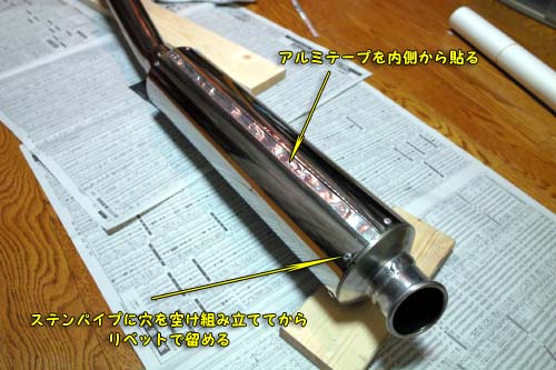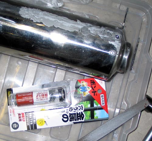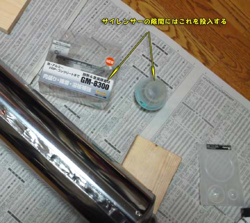 | ステンレスのパイプを縦に切ったので、まずは、簡単に組み立ててパイプの大きさが中身の部分と丁度良いサイズになるように針金で強めに縛る。 次に一旦ばらして、排気漏れがないように裏側から幅広のアルミテープ(台所用?)を貼る。 その状態で、サイレンサーを組み立ててリベットで固定していく。 ここで、登場願ったのが、GM-8300という補修剤-先進エポキシ樹脂である。 自分は他の目的で一年前にオークションで入手したが、他の方法で問題が解決したので使わずに置いてあった。(先日立ち寄ったアストロプロダクツにも置いてあった。) ステンレスパイプの縦の隙間は10mmくらいあり間にアルミ板(1mm厚で幅は8mmくらいで長さはサイレンサーに合わせた)を置いて、後はGM-8300にお願いすることにした。(GM-8300について:ブレニー技研が作った次世代エポキシ接着補修剤で詳しくはこちらです) |