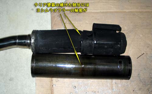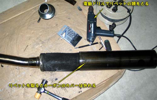 | まずは、ヨシムラのマフラーの分解だ。 ドリルをリベットの部分にあてて表の部分を取り除く。 ドリルの刃は6.5mmでリベットの頭の部分をもみながらすると頭の部分だけとれる。 次に2.5mm→3.5mmのドリルに付け替えて穴の部分を掘って、ある程度でポンチみたいなもので穴の部分にあてがいハンマーで叩くと残りのリベットが内部に落ちる。 エンブレムドリルをあてたついでに、ヨシムラのエンブレムとJISMAのプレートのリベットもとってしまう。 全てのリベットを外すと分解できる。 まずは、テールのアルミの部分を引っ張ると比較的簡単に抜ける。 次に、カーボンの筒を引っこ抜くのだが、一人では意外と大変である。 ステンレスパイプをどこかに引っ掛けて、カーボンサイレンサーのカバーを真直ぐに引っ張るようにすると抜けるが。 ヨシムラのマフラーは個人で分解を行っては行けないのかもしれないので、自己責任で! |