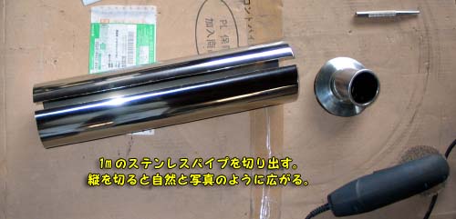| 購入先は、オークションで出品されていた、外径101.6mm厚さ1.5mm長さ1000mmのステンレスパイプを6,000円で落札し送料は1,000円だったので、手数料込みで7,000円強で手に入れた。 思った以上の出費におののく自分であった。 |